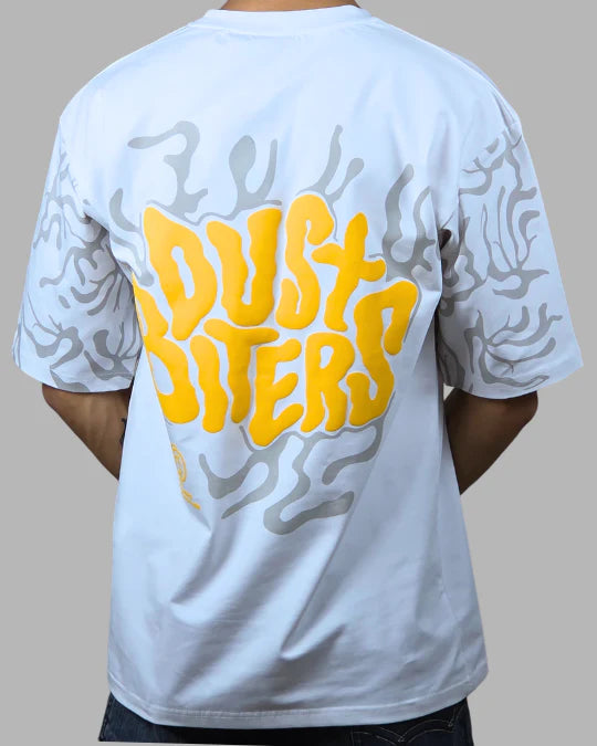 The White, oversized T-shirt with a graphic design on the front and sleeves. The front of the shirt features the text "DUST BITERS" in a stylized, white font, with abstract gray shapes surrounding the text