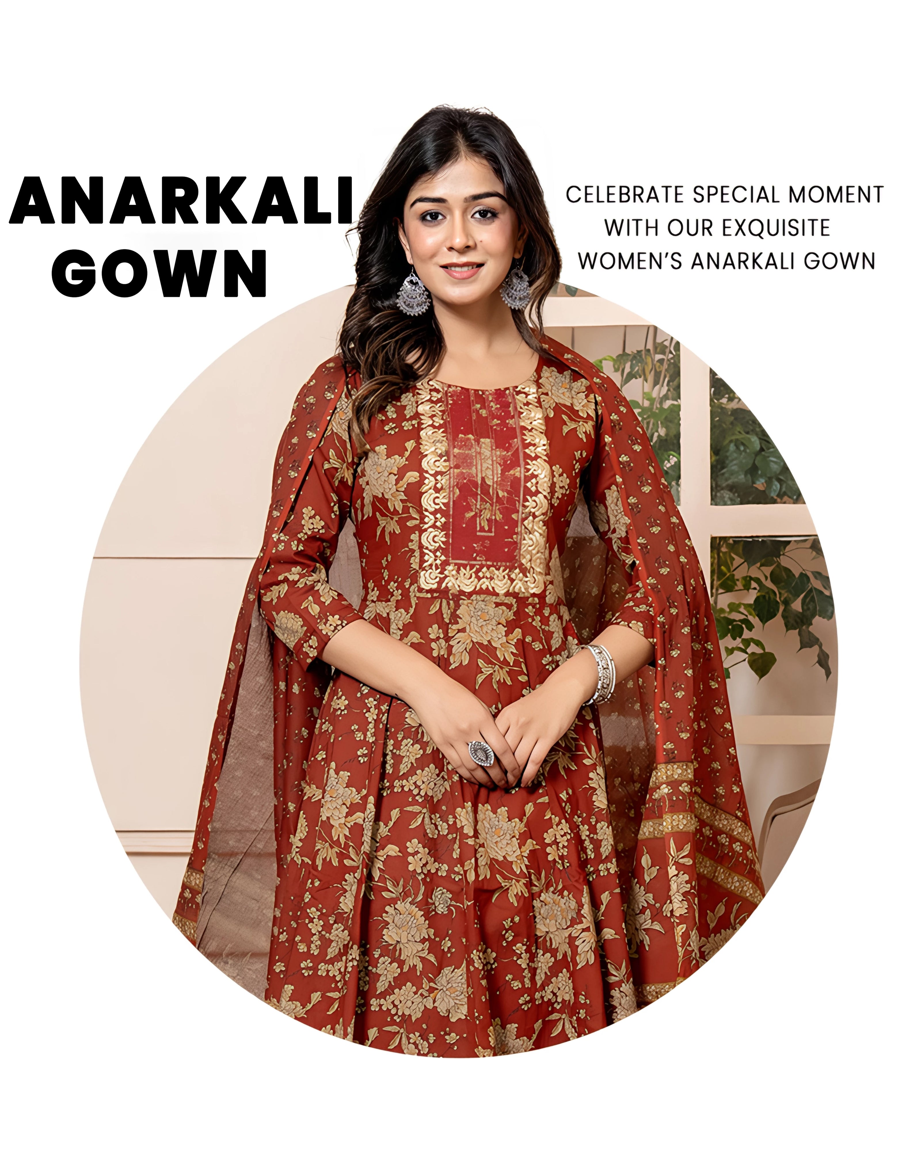 Red Anarkali Gown - 3Pc Suit - Floral Print - Cotton (Kurti, Pant, Dupatta)